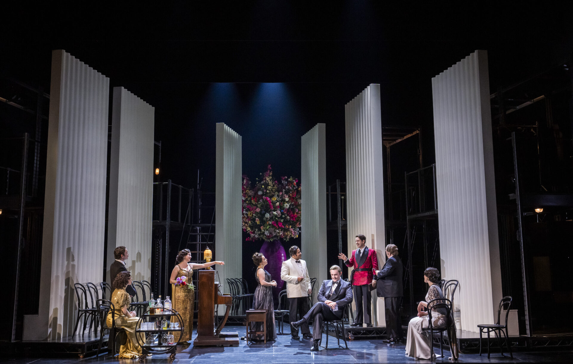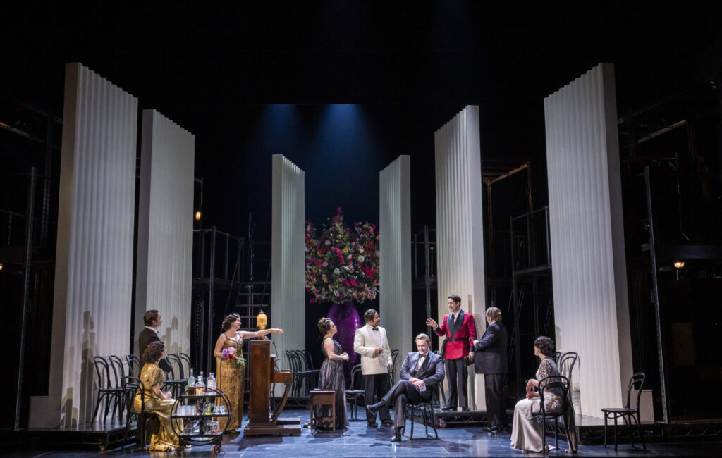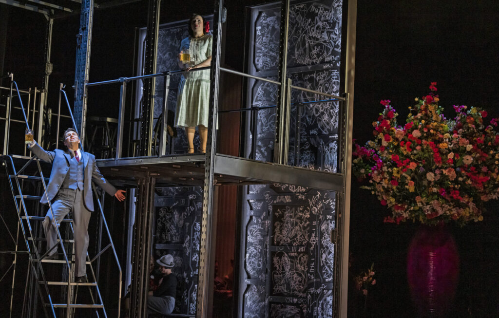 For Opera North’s “Green Season,” all three operas—Falstaff, La Rondine, and Masque of Might—shared scenic elements with a focus on reducing material use and creating new designs that were both distinctive and a similar aesthetic for continuity. All sets, props, and costumes were sourced from previous productions to adapt for reuse or purchased second-hand. Everything was brought to life in a reimagined and sustainable way.