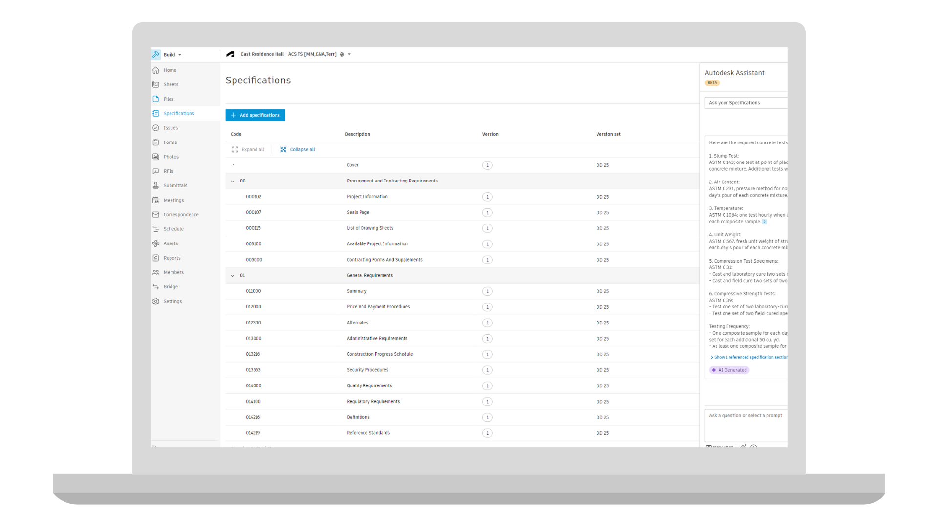 The AI-powered Autodesk Assistant empowers you to find key information about your projects in a simple chat interface. This first release of Autodesk Assistant gives you more intuitive ways to access, validate, and summarize critical information in published project specifications. You can ask the Assistant to answer specific questions, generate lists of items, or draft summaries to share with your team. You can also save your questions to a prompt library to easily use them again.