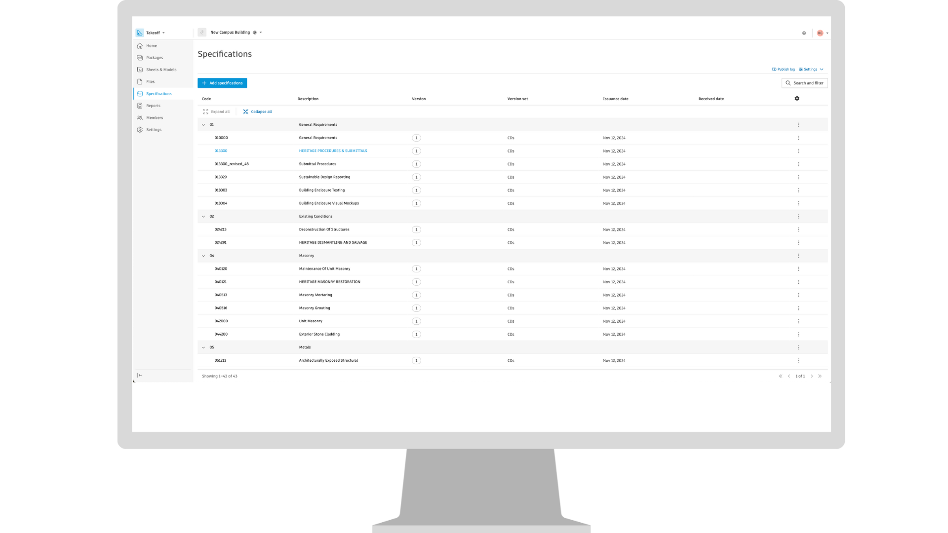 Members can now access the Specifications tool within Autodesk Takeoff, giving them access to the same content available in Autodesk Docs and Build. By leveraging Autodesk AI, the Specifications tool provides a more efficient and automated approach to preparing specifications to support easy section navigation, advanced search, and cross-reference to other workflows in Autodesk Construction Cloud.