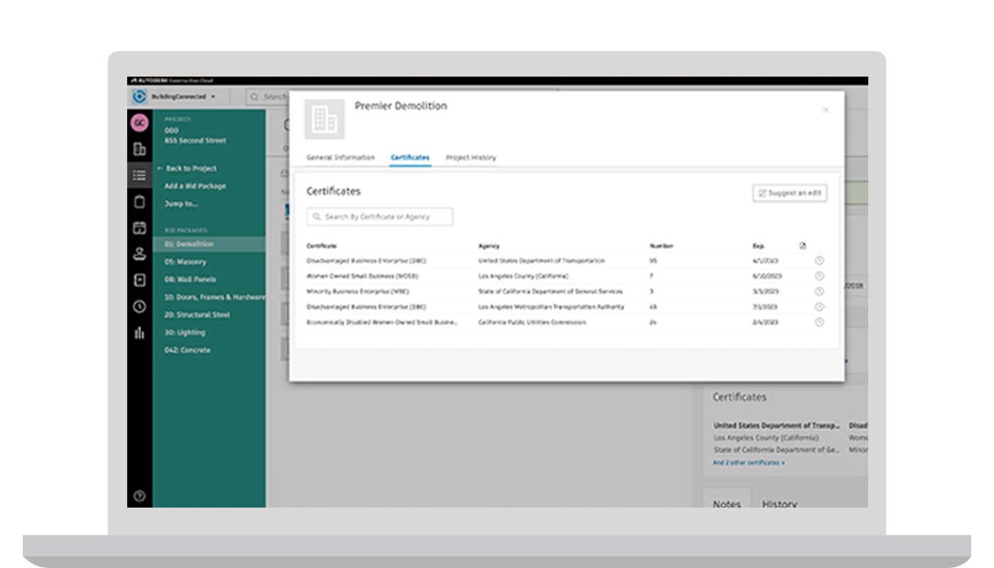 Subcontractors can add their business enterprise certifications (e.g. disadvantaged, veteran, minority, small business, local) to their profile so that GCs can reliably search, identify, and track diverse partners during the bidding process.