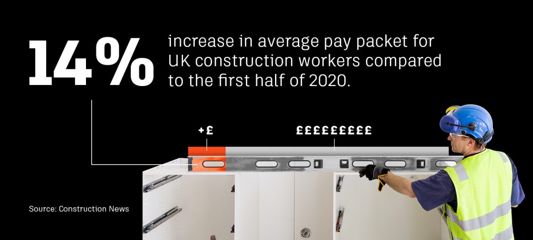 - Fourteen percent: the increase in average pay packet for UK construction workers compared to the first half of 2020. [Construction News]