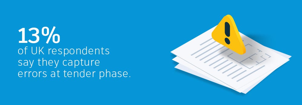Errors on construction documents at the tender phase can ripple through a project. Seeing the issues that arise and comparing them with similar previous projects can enable contractors to work to avoid the same problems in future. Only 13% of respondents from construction companies in the UK capture errors at tender phase compared to 33% in Ireland.