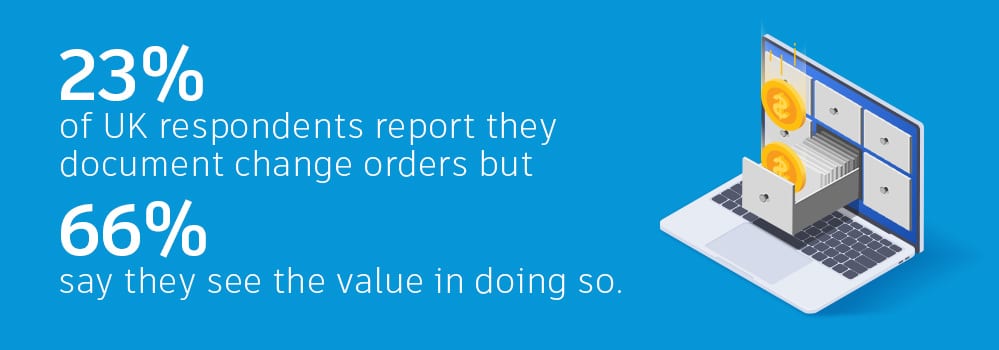 When the original project contract or schedule gets amended, it can cause delays and may result in additional costs being incurred. We asked how often respondents collect and document change orders, including turnaround times, root causes and programme impact. In the UK 23% of respondents document change orders, of those 66% see value in doing this which is the same response rate as their Irish counterparts. In Ireland, while documenting change orders was something 38% of respondents do on projects there is still a gap between those who find it valuable and those who do this.