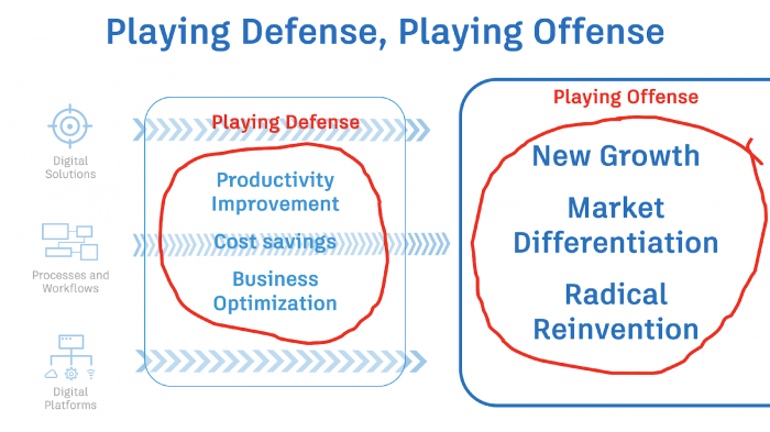When you play offense, the rules of the game are different. Your strategies and your plans for playing defense are not appropriate for our offensive moves. You'll need to intensify your digital efforts. Instead of simply testing or developing solutions, you also need to scale those solutions across your company, and even within the ecosystem of companies around you. You cannot just tweak your processes and workflows. You need to define new ones.