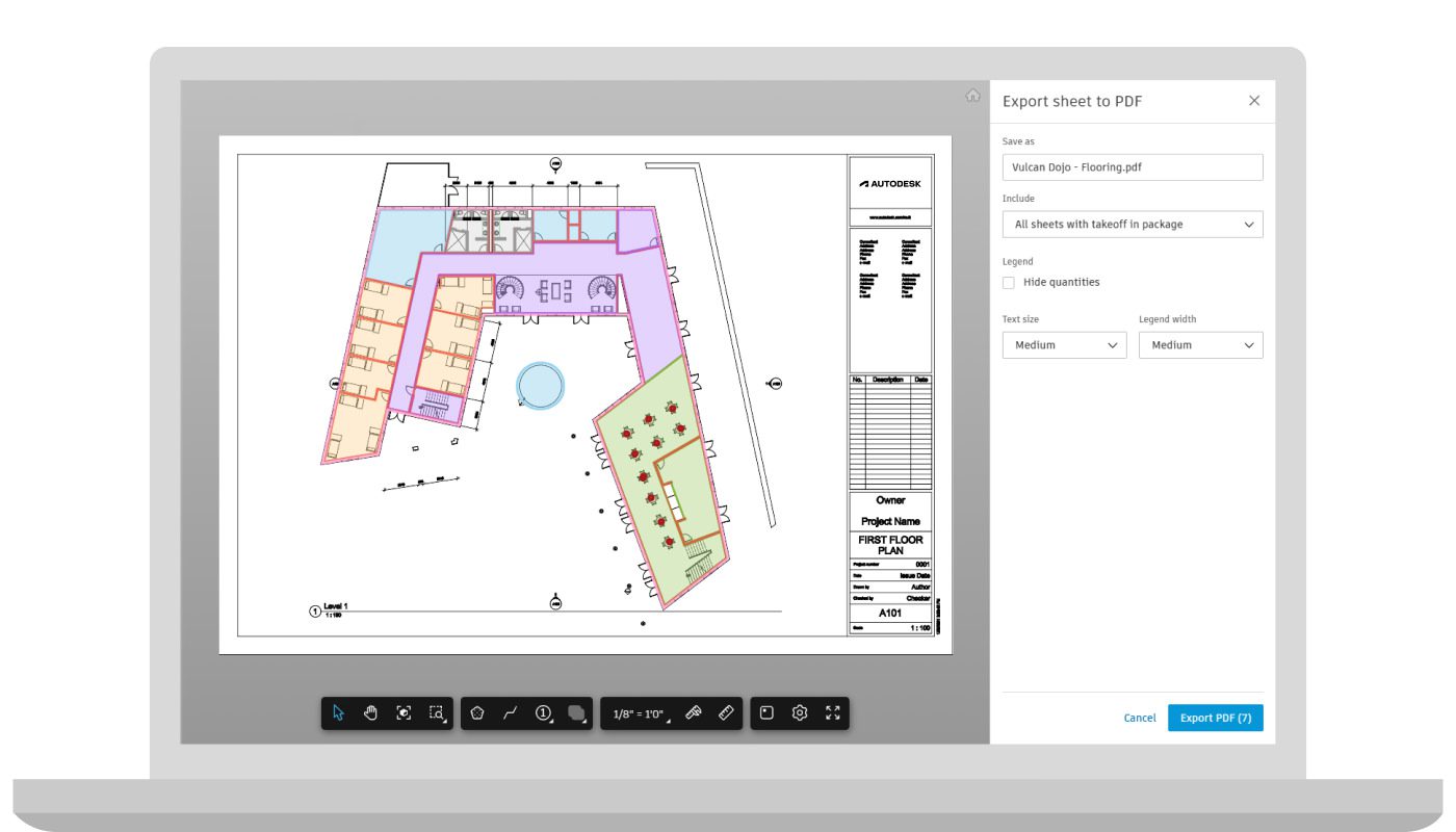 Takeoff | PDF Export Enhancements – Adding further capabilities to the PDF export functionality in Autodesk Takeoff, users can now export multi-page PDF with takeoff and legend. This allows users to save and share information with internal and external stakeholders that may not have access to Autodesk Takeoff in a more efficient manner.