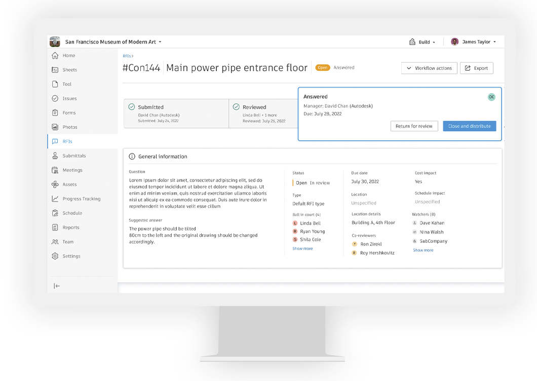 RFIs | RFI Report Link in Email Notifications –Under RFI advanced settings, Project Admins will see a new toggle titled Include RFI Report Links in Email Notifications. When turned on, a link to the RFI Detail Report will be included in RFI email notifications. The report is accessible to both project members and non-members involved with the RFI, includes PDF attachments, and does not include the activity log or comments.
