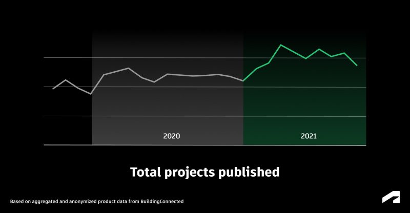 According to aggregated and anonymized product data from BuildingConnected – a collection of over one million owners, general contractors, construction managers and subcontractors soliciting or submitting bids – 2021 was a year of record growth for the industry, with new projects published increasing almost 19 percent year-over-year on the platform. March of 2021 also hit a new all-time record for most projects published in a single month, followed closely by June 2021.