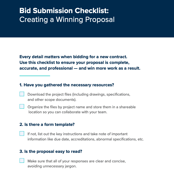 That’s why we created this construction bidding submission checklist. Using our PDF checklist, you can quickly review your proposal to ensure no important details (e.g. certifications, addenda, due dates) slip through the cracks.