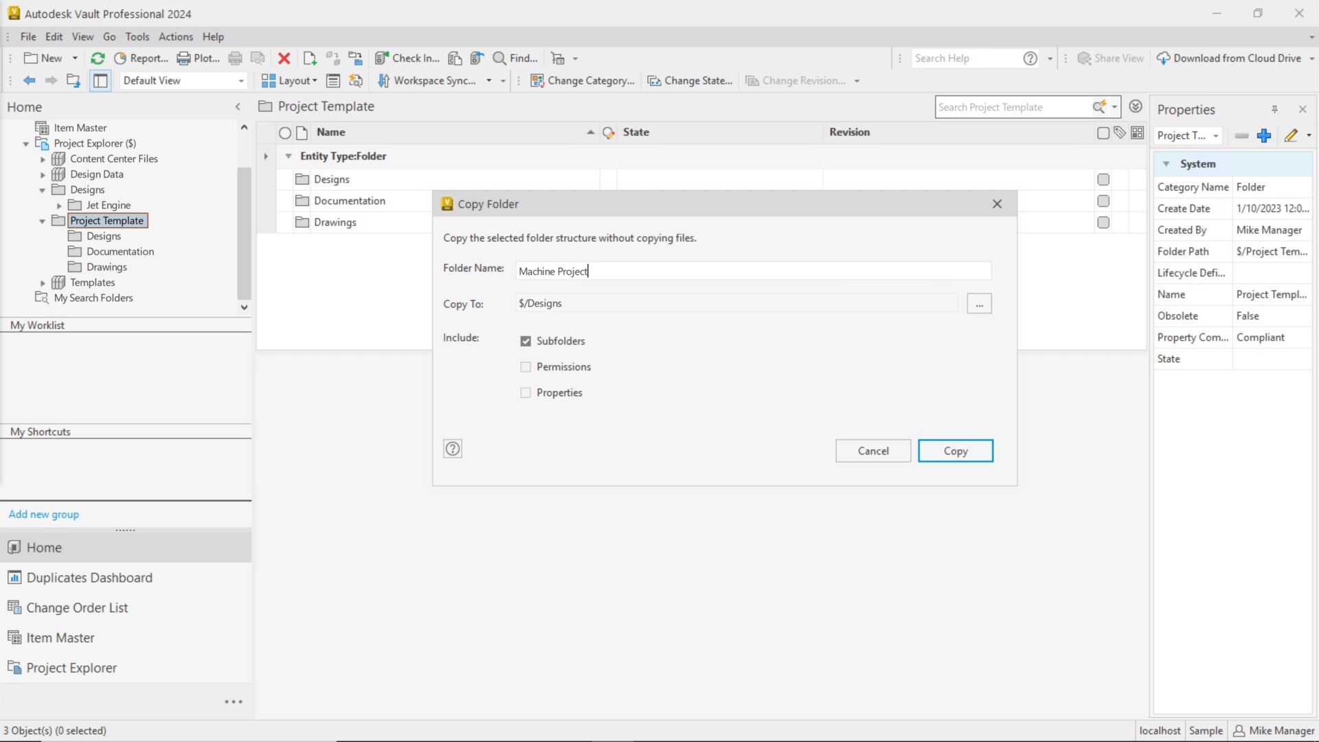 New Copy Folder functionality in Vault 2024 makes it easy to set up a new project quickly by starting with a known folder structure. The Copy Folder feature can copy a folder’s original structure, including subfolders, folder permissions, and properties. This lets you quickly organize your data and help teams adopt engineering standards.