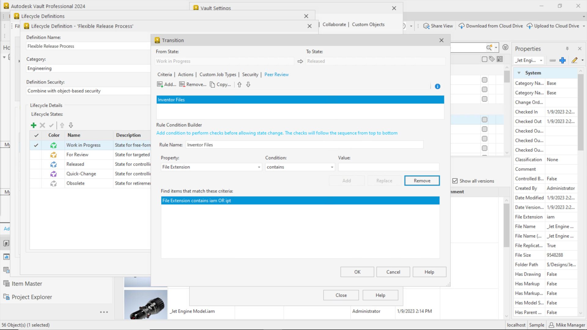 Enforce peer reviews for state changes to facilitate delegation of authority and increase transparency. When approving designs in Vault, you can now configure a peer review check that must be met before a state change can occur. This will ensure that someone else on the team must review the design before it is allowed to move to the next state in the process. This functionality can be used to facilitate the delegation of authority and increase transparency.