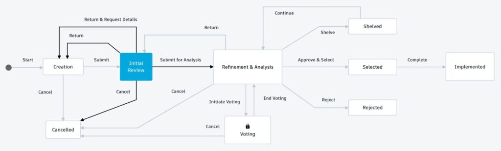 Each idea submitted undergoes a designed workflow to ensure a comprehensive evaluation. Once you created an idea, it progresses into the initial review phase. In this stage, the predefined review team examines the submission to confirm whether it has included all essential information for a thorough analysis. The subsequent refinement and analysis stage serves as a stage in the process, where you or the review team decides the fate of the idea. The dedicated review team, supported by the insights gathered during the initial review, decides on whether to approve, reject, or place the idea on hold for future consideration. This workflow not only eases the decision-making process but also emphasizes the importance of a thorough and collaborative approach to idea management by giving each idea the attention it deserves.