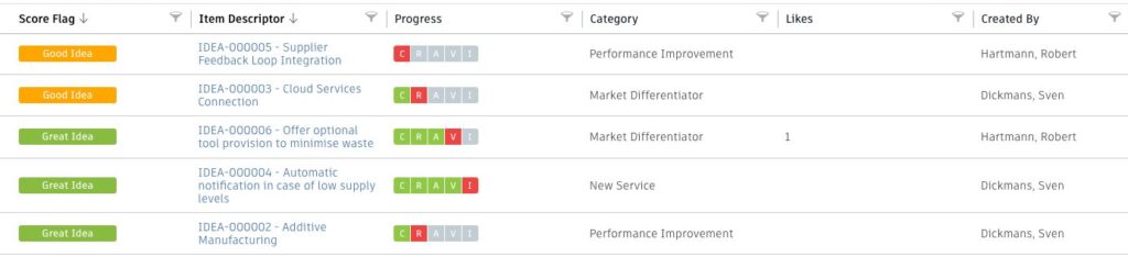 Recognizing that ideas can impact different parts of the organization, the template enables users to associate their submissions with specific products or product lines. This helps in understanding the potential areas of impact to even further improve the evaluation of the idea. Another part that helps to streamline the management of ideas are the Key Performance Indicators (KPIs). These indicators, including strategic fit, market attractiveness, innovation, and cost savings, provide a structured framework for assessing the viability and value of each idea. This comprehensive assessment contributes to assigning a score, ultimately determining whether an idea is deemed favorable or unfavorable.