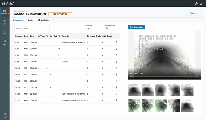 This new platform is designed to help condition programme managers review CCTV surveys and add their own professional observations. While simultaneously visualizing auto-synchronized survey videos and their observation grid, you can easily add, edit, or delete any observations. When this process is done, simply publish the inspections to the asset registry, so that other utility stakeholders can access the data.