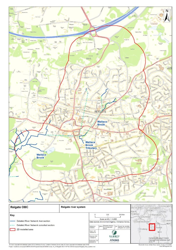 The updated model results verified well, and expected areas were modelled to flood. However, applying a 5% (1 in 20 annual probability) rainfall event didn’t activate significant flow routes which had been historically observed in the center of Reigate.
