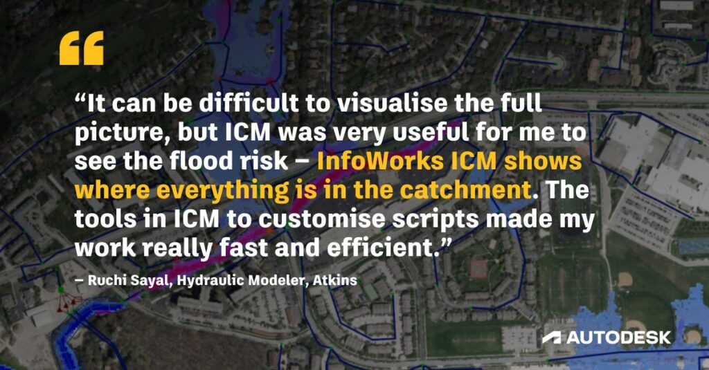 Being able to bring everything together in one place was a big help. “It can be difficult to visualise the full picture, but ICM was very useful for me to see the flood risk. InfoWorks ICM shows where everything is in the catchment,” she explains. “The tools in ICM to customise scripts made my work really fast and efficient.”