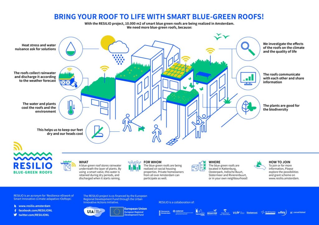 If you’re looking for a model to follow for this kind of project, look no further than RESILIO. As a partner in this project, Waternet, the public water management organization in Amsterdam responsible for nearly all facets of water in the Netherland’s most-populous city, has built strong coalitions with the city of Amsterdam and eight other stakeholder organizations to install smart roofs in four Amsterdam neighborhoods. And they’ve been carefully measuring the results.