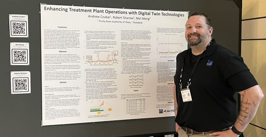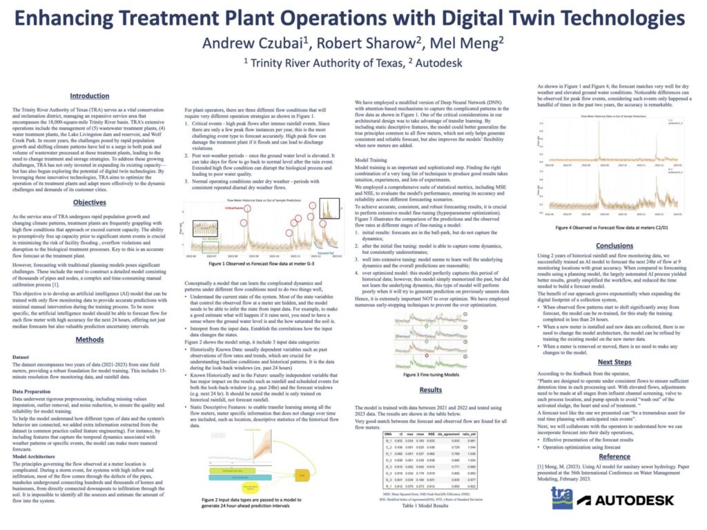 Autodesk Senior Technical Support Engineer Mel Meng, Autodesk Principal Data Scientist Robert Sharow, and Trinity River Authority Hydraulic Engineer Andrew “AJ” Czubai presented a poster on their findings around “Enhancing Treatment Plant Operations with Digital Twin Technologies” which was filled with practical use cases of AI and digital twins in water operations and management.