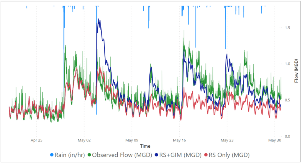 The TRA team successfully modeled the ROCRWS system inside InfoWorks ICM and calibrated a model with a simulated duration of 2 months using the InfoWorks ICM Ground Infiltration Model. The team utilized data from the 20 distributed temporary flow meters and made the necessary modifications to match the modeled and observed conditions.