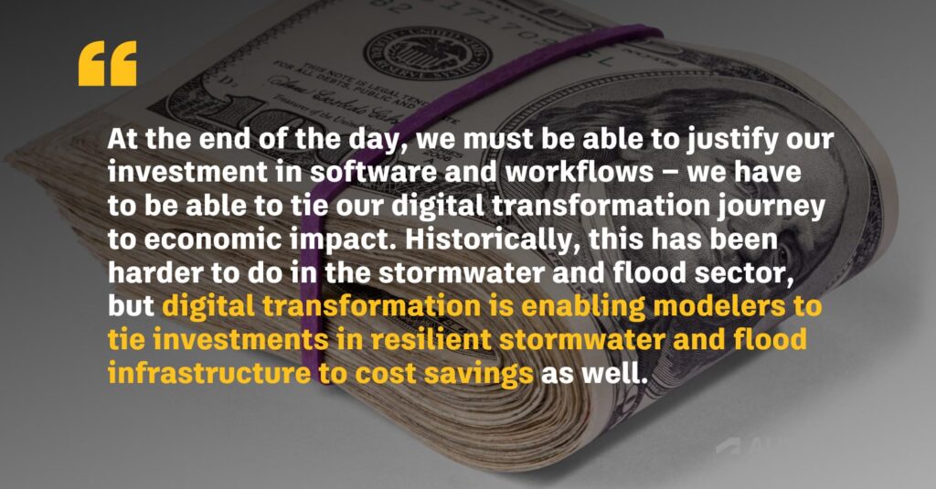 Historically, this has been harder to do in the stormwater and flood sector, but digital transformation is enabling modelers to tie investments in resilient stormwater and flood infrastructure to cost savings as well.