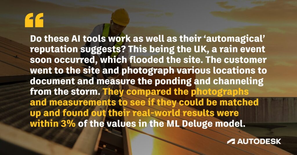 Do these AI tools work as well as their ‘automagical’ reputation suggests? This being the UK, a rain event soon occurred, which flooded the site. The customer went to the site and photograph various locations to document and measure the ponding and channeling from the storm. They compared the photographs and measurements to see if they could be matched up and found out their real-world results were within 3% of the values in the ML Deluge model.
