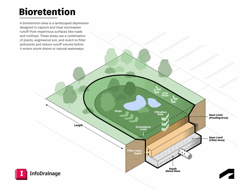 Bioretention areas are also sometimes called bioswales or bioretention cells (and sometimes rain gardens, although they are semantically different). Bioretention areas are essentially shallow engineered depressions that are designed to capture and infiltrate stormwater runoff from impervious surfaces like rooftops, driveways, and parking lots. Bioretention is often integrated into parking lot islands or medians to manage runoff from these areas.