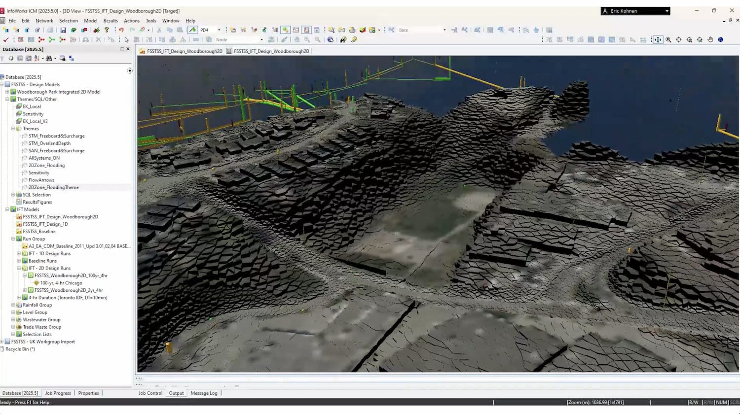Using Autodesk’s InfoWorks ICM, the team combined 1D network modeling with detailed 2D surface modeling to capture the full picture of flooding behavior across Woodborough Park. This integrated approach allowed them to understand not only how the sewer system performed, but also how water flowed across the park itself.