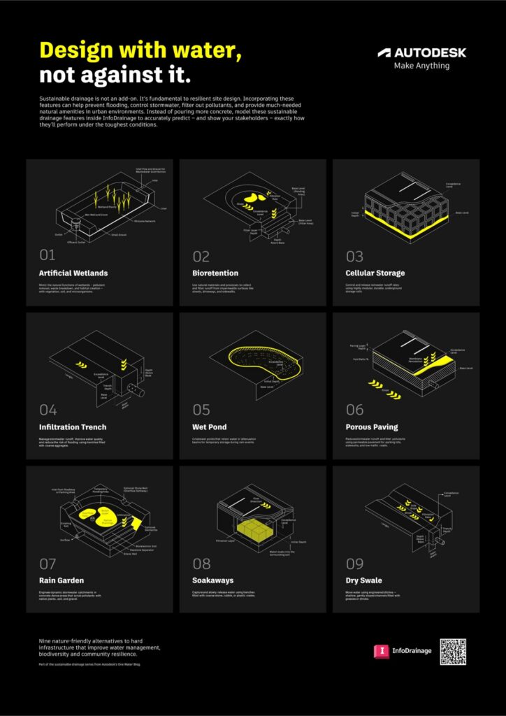 - Check out our articles for all of the SuDS features inside InfoDrainage. We encourage everyone to use the illustrations in these articles in industry presentations or whenever you want to show clients or community stakeholders how these features work – and why they are better than pouring more concrete.