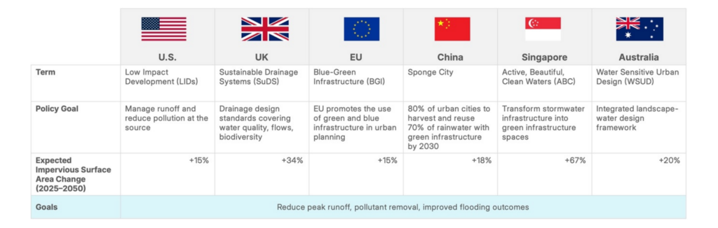 Across regions, the terminology for implementing sustainable drainage may differ, but the direction is consistent. In the US, it’s Low Impact Development (LID); in the UK, Sustainable Drainage Systems (SuDS); in the EU, blue-green infrastructure; in China, sponge cities; and in Australia, Water Sensitive Urban Design (WSUD). Each framework reflects local policy priorities, but all point toward the same outcome: reducing runoff, improving water quality, and delivering better flood resilience through integrated, nature-based approaches.