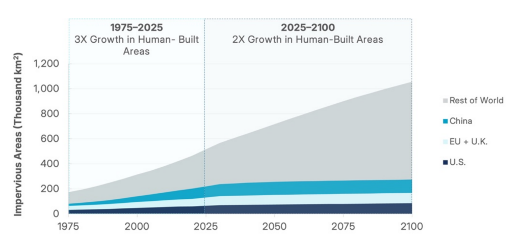 Second, urbanization continues to accelerate. Human-built areas have already tripled over the past 50 years and are expected to double again by the end of the century.