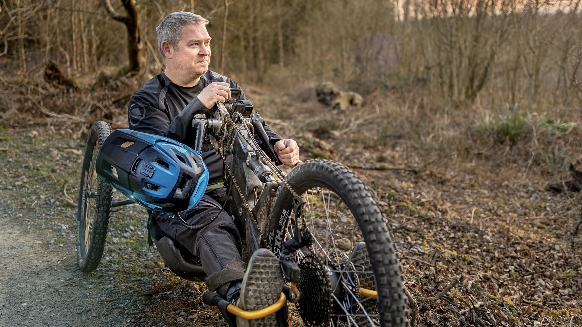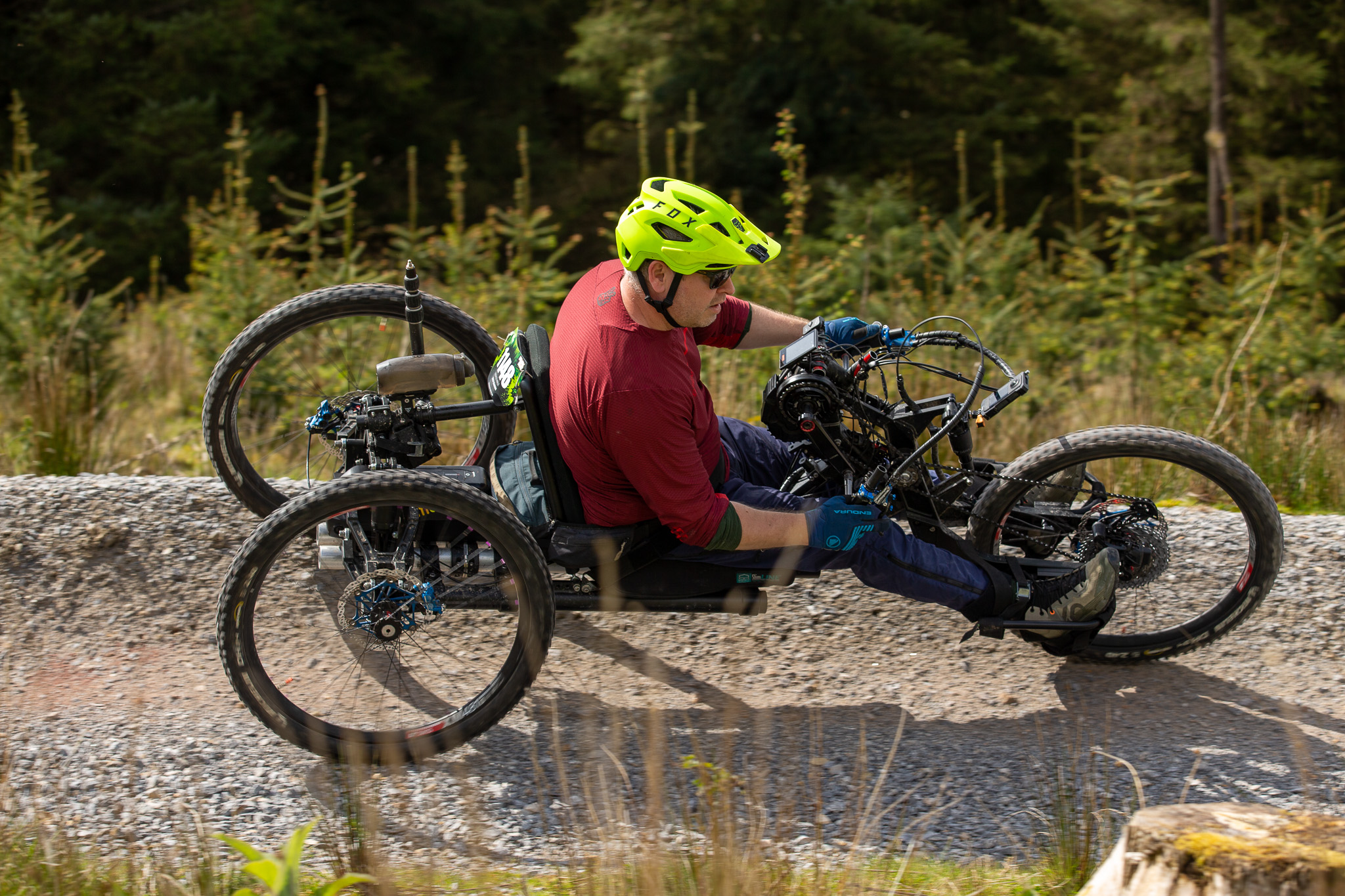 During this time, he found himself literally getting back on the bike—albeit with three wheels instead of two. His first bike was very rigid and simple. One day, his neighbor saw him on it and suggested some trails in the nearby Slieve Bloom mountains.