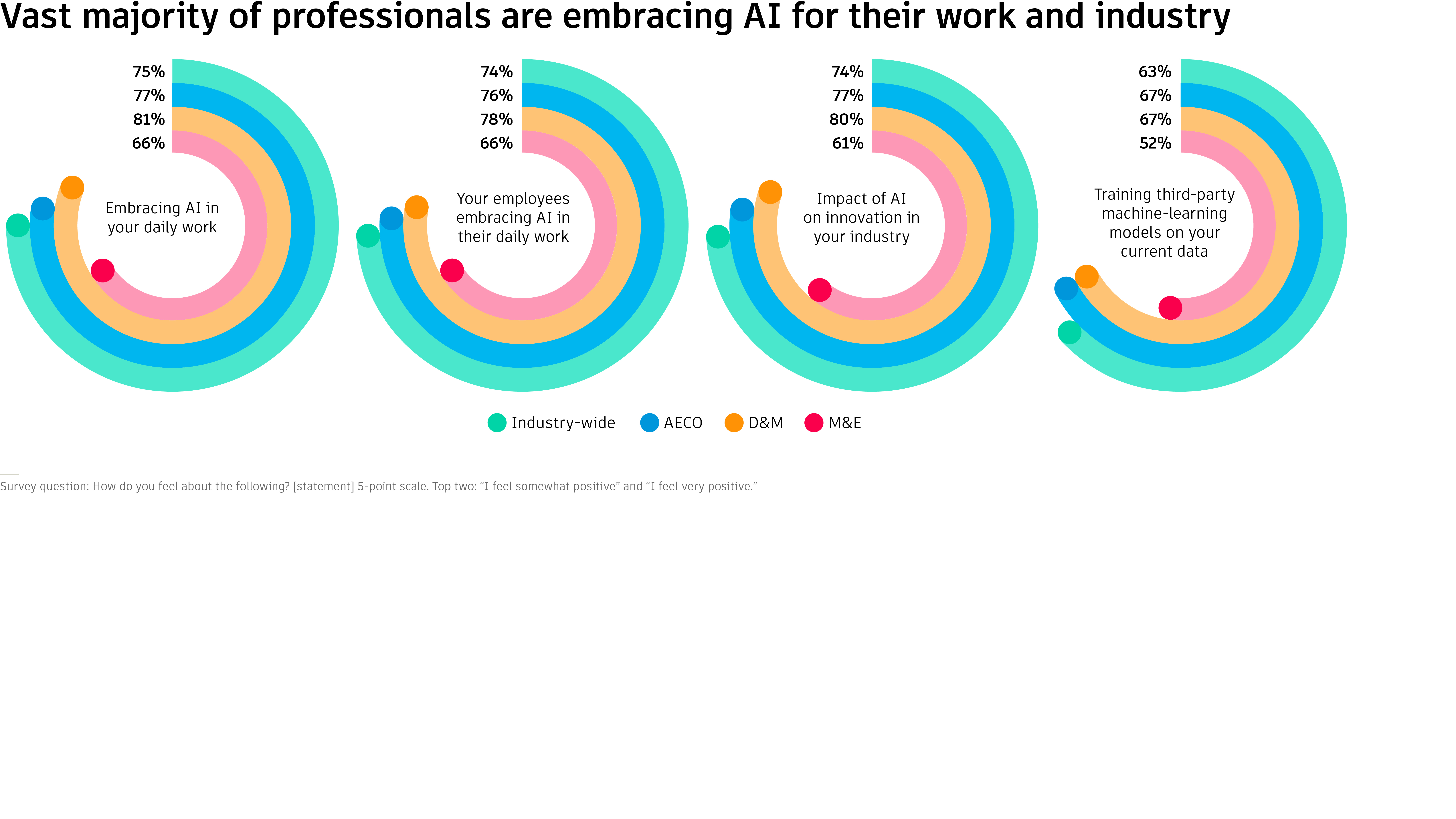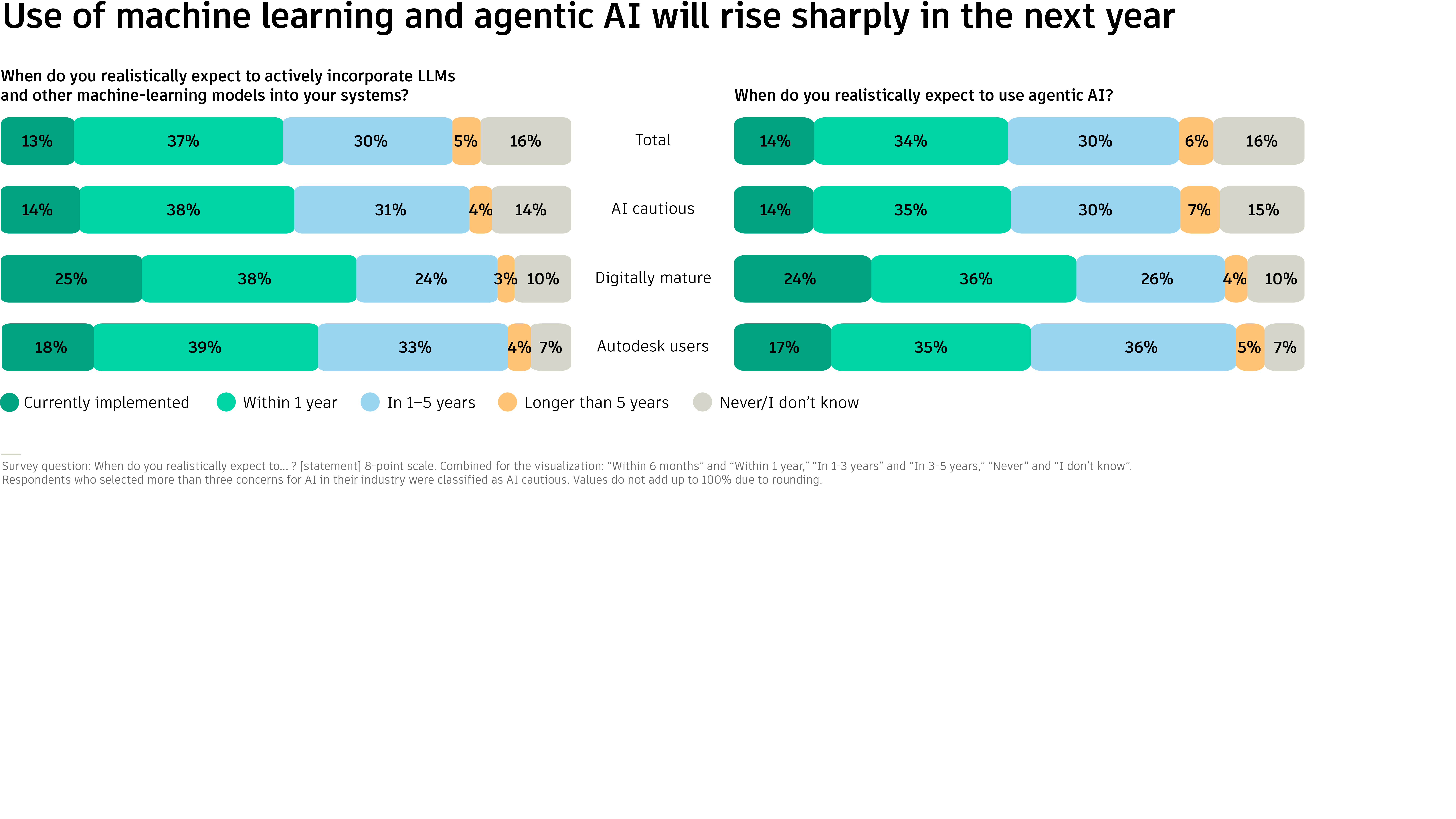 In this survey, “digitally mature” companies are defined as those that are approaching or have achieved the goal of their digital transformation journey. “Less digitally mature” companies are defined as those that are in the early stages or right in the middle of their digital transformation journey. An “Autodesk user” is a respondent whose company has used an Autodesk product within the past 12 months. AI “early adopters” are respondents who report AI awareness, training accessibility, and adoption encouragement from leaders and peers.