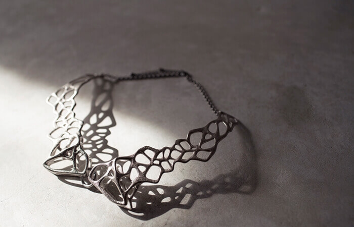 Sato is fascinated that she can use computers to design something that would be impossible to craft by hand, and she uses a 3D printer to output the intricate jewelry and accessories she designs. A base model made of wax resin generated through stereolithography can be cast to metal, or she can print nylon-resin items that are ready to wear. The complex shapes and surprising lightness of the 3D-printed products add to their appeal.