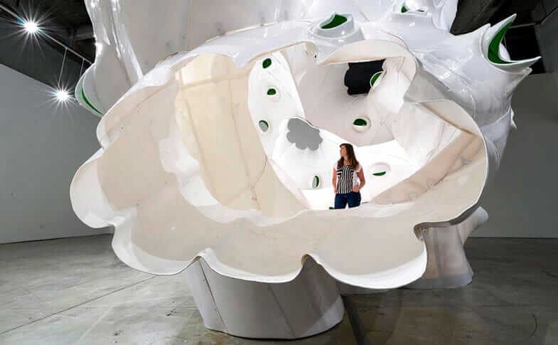 The “Apertures” installation by B+U Architecture is similarly focused on feedback loops, but it posits an entire building as an organism. Made of white thermoformed plastic polymers that look like Storm Trooper armor with green barnacle-shaped portholes, the installation’s organic geometry calls to mind Jack’s beanstalk if it were cast in a sci-fi epic.
