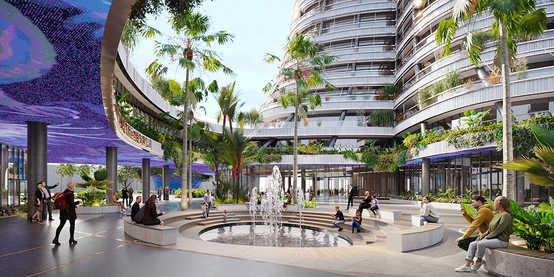 This remote scenario was ideal for Hainan. Clients at the Hainan Future Office Park Investment and Holding Co. wanted to build a landmark miniature city on the island, one that would model the work environments and infrastructure that attract big tech companies, such as Google or China’s Tencent, and generate jobs for all levels of qualification.