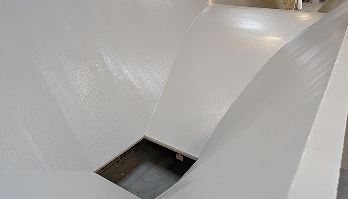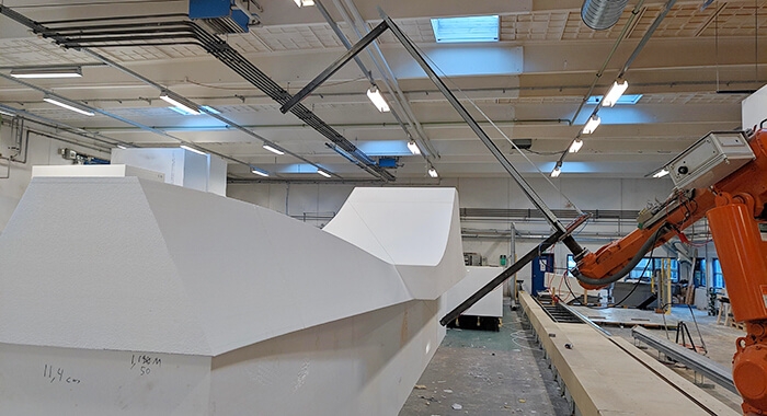 To begin the construction process, Odico Construction Robotics in Denmark created a mold for the alternately rectilinear and sinuous concrete forms. The mold was cut into shape by a 7-axis, robotic abrasive wire-cutting arm, which sliced and formed it like a giant lathe. (The mold is made of expanded polystyrene, a close cousin to Styrofoam that’s stronger and denser.) Working from CAD drawings, this diamond-tipped, articulated bandsaw runs on custom digital-fabrication software, cutting through mirrored forms that play to concrete’s strengths and cover up its weaknesses.