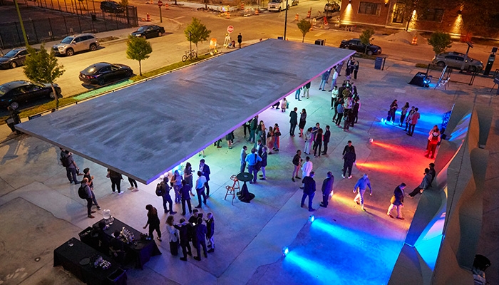 And while the roof of the pavilion is a pure rectilinear slab (resembling a high-rise floor plate), there’s subtle poetry to how it’s supported. Waves of concrete flow out from the slab and coalesce at its square columns, like part of an inverted, exactingly symmetrical skate park. The pavilion’s mold, shipped to Chicago from Denmark so it could be cast in place, is on-site in Chicago’s West Loop neighborhood.