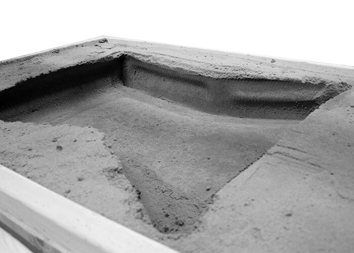 With the right amount of water in the mix, the green sand can remain rigid for weeks. “By concrete 3D printing into these precise molds, you get really sharp edge conditions, so now, even though the interior is printed, you’re getting the precision of a casted edge,” says Battaglia.