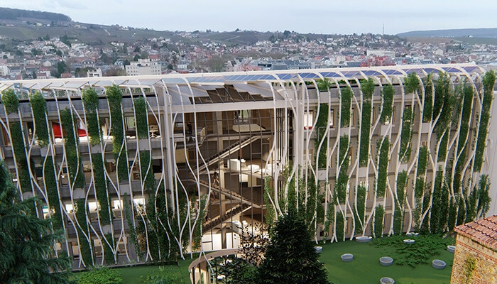 So when management and accounting association CDER wanted to expand its offices in Épernay—also known as the “capital of Champagne”—it was important for the company to align with the region’s values. CDER originally sought to tear down a building adjacent to its offices—a blocky 1960s structure infamous in the area. “Everybody knows this building, and everybody hates it,” says Aurélien Leriche, architect manager of Paris-based firm OuyOut. But the hired architects saw the old building with an outsider’s eye, noting its efficient use of space, and pitched a green renovation—a less costly alternative that could bring the village eyesore into harmony with its surroundings.