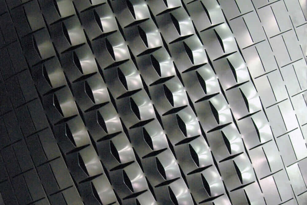 As part of a long-running collaboration with metal fabricator Milgo/Bufkin, Lalvani has found a way to turn 2D perforated sheets of metal into rigid 3D structures. His process is proprietary to Milgo/Bufkin, but in general, it involves using a computer-controlled laser cutter to perforate the sheets in patterns that will allow it to be stretched into a 3D object. Some type of force is applied—sometimes just gravity—that pulls apart the spaces made by the perforations. (Imagine cutting a spiral in a piece of paper and watching the coil telescope down into three dimensions, and you’ve got the basic idea.)