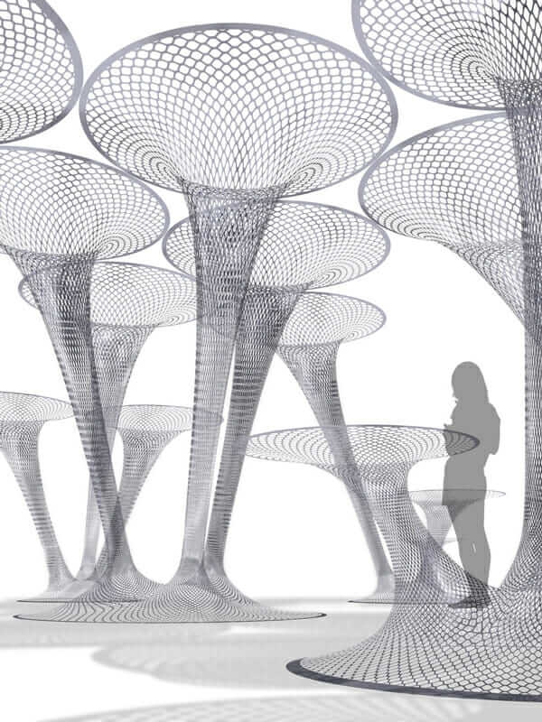 Whether it’s at the scale of furniture or a small building, there’s an intriguing sculptural quality to Lalvani’s work (for which he uses Autodesk AutoCAD and other software) that owes as much to art as it does to architecture. Textures arise from the cross-hatched perforations, and hyperboloids and paraboloids stretch out like sci-fi tendrils.