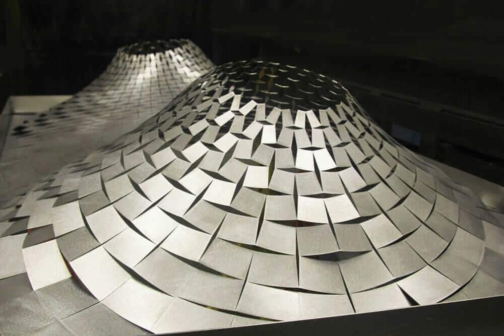 One project, for example, involved perforating a flat circular disk and then rolling a bowling ball across its surface until the seams between the perforations separated and formed a dome. “So we invented a new way of forming,” Lalvani says.