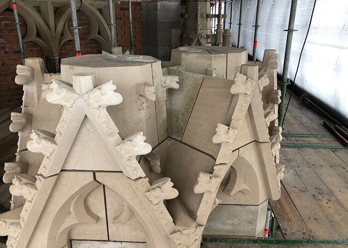 Defects in the stone and brick are the main focus, along with rusting anchors in the tower’s octagonal lantern, which still holds much of the original structure’s 14th-century building material. A host of carved wooden elements, panes of stained glass, the tower’s main clock, and the lead and slate pieces that comprise the spire all need attention, too. By 2024, when the restoration is expected to be complete, close to 600 cubic meters of stone will have been replaced.