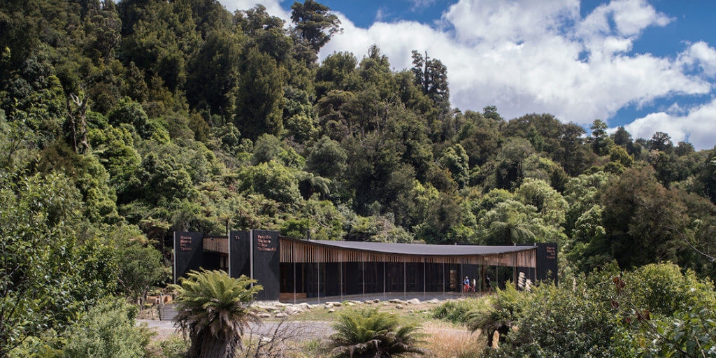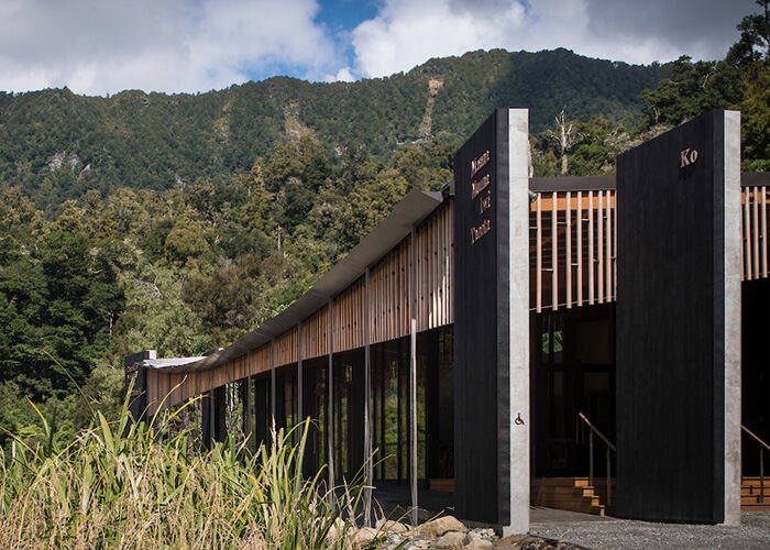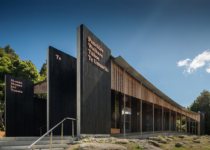 The design incorporates a draped roof mirroring the life-giving force of Lake Waikaremoana's waters, and a timber screen sourced from tōtara to filter light and create a connection to the surrounding forest.