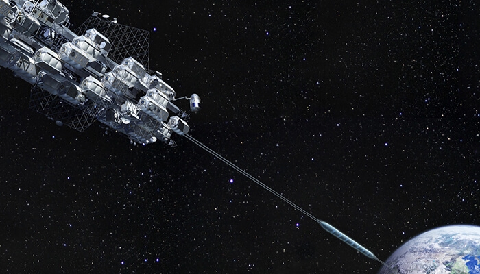 The space elevator is an electric vehicle called a “climber” that drives up and down one thin tether between the ground and a satellite in stationary orbit, using another outside tether for balancing with centrifugal force. The total length of the tether extends to 100,000 kilometers (62,137 miles).