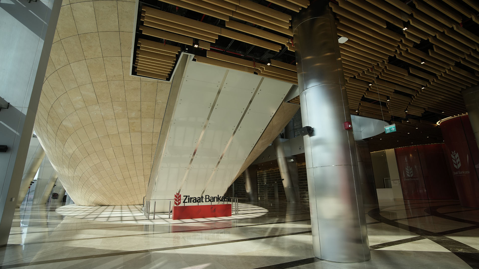 Completed by Kalyon Construction and designed by the architecture firm KPF, the complex comprises two glass towers atop a shared eight-story podium. This curvilinear glass podium is crossed by multiple bridges that connect the towers. At the ground level, the form of a water-smoothed stone—the auditorium and conference center—is clearly visible through the glass, drawing people into its tactile form.