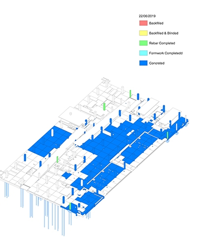 “At the end of the day, we have this big model with a lot of key project data available to everyone,” Tizzani says. “You can see when we last drilled a pile, poured concrete, struck the formwork, or did a quality check. We invested a lot of resources into building the digital twin so we can better understand the job and use the data collected onsite in a more meaningful way.”