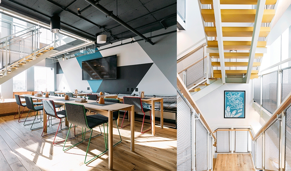 Groups of three floors are branded and identified as “neighborhoods,” each with a different graphic identity. For example, floors seven through nine at 110 Wall St. have a synchronized-swimmer graphic wall-covering theme. And each neighborhood has a communal kitchen and larger lounge space. “We try to accommodate all aspects of live-work,” says Kerns, who lived at the Wall Street location for six months.