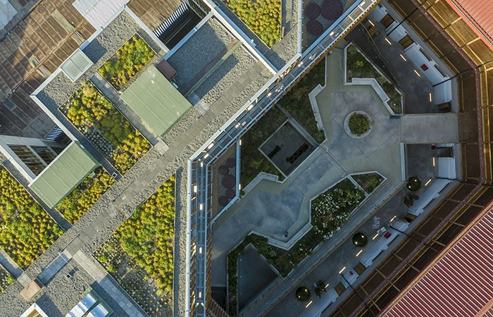 Sustainability was another key priority throughout. To reduce the amount of energy required to operate the new building, the design team flooded it with natural light, carefully placing windows and using a mullion system on the facade to control solar-heat gain during Santiago’s hot summers. The introduction of a green roof provided additional cooling benefits, and in the central plaza, shade from native plants offers respite from the sun. In the historic building, the designers added insulation to walls and introduced a fan coil system to provide efficient heating and cooling.