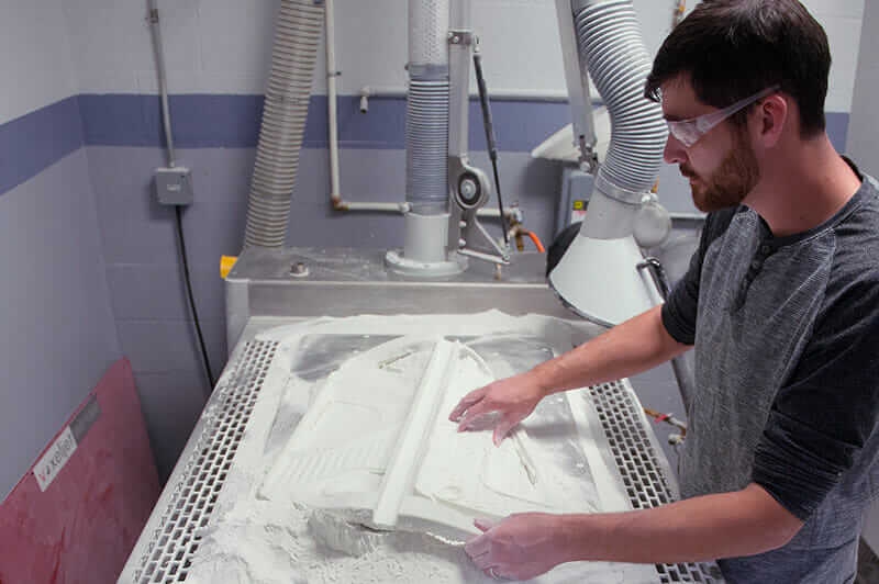 A worker prepares a 3D-printed seat-frame mold at Aristo Cast.