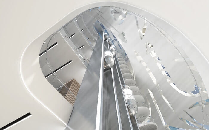Tommaso Calistri, an architect with Killa Design, adds that the double helix also serves a practical function: Because staircases land at different places, the configuration allows differentiation between people who have paid the entry fee and those who haven’t, such as people who just want to pop in to experience the architecture. “It’s definitely an emotional building, because you will pass through and experience the building,” he says.“You will not just pass next to it without turning your head. That’s what I think architecture should do: make your head turn.”